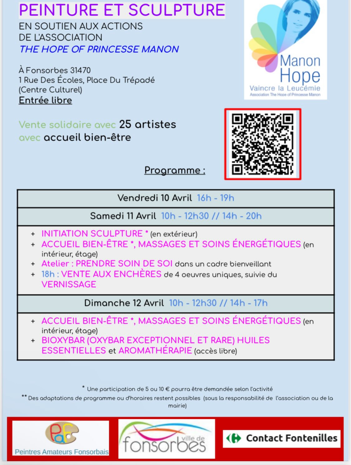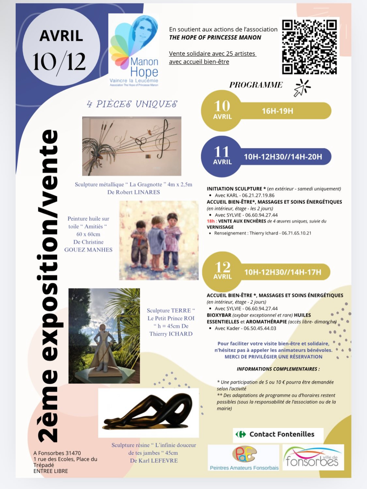 Vous cherchez une exposition à Fonsorbes en avril, un événement culturel près de Toulouse ou une activité bien-être en Occitanie ? Ne manquez pas la 2ème édition de l’exposition / vente solidaire organisée au profit de l’association The Hope of Princesse Manon. Pendant trois jours, cet événement propose un véritable week-end bien-être à Fonsorbes, avec des activités accessibles à tous, dans une ambiance chaleureuse et conviviale.