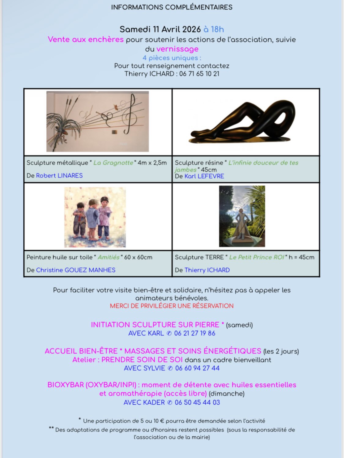 Ne manquez pas cet événement artistique et bien-être à Fonsorbes. Réservez vos ateliers dès maintenant pour garantir votre place et vivre un moment unique, entre art, détente et solidarité. Pouur plus d’informations consultez notre brochure :